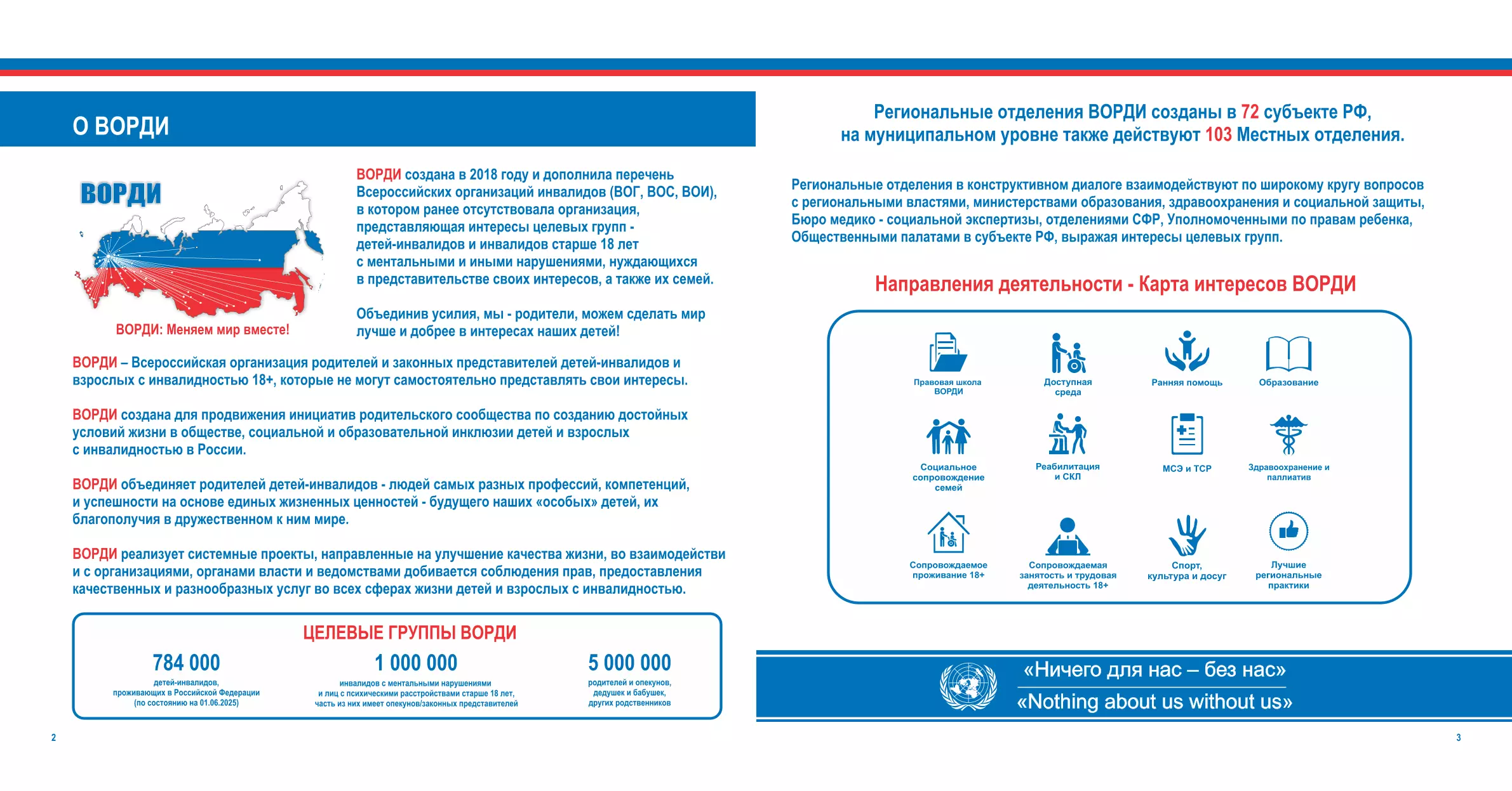 Целевые группы ВОРДИ - дети-инвалиды и инвалиды 18+ (инвалиды с детства), интересы которых представлены родителями/законными представителями.