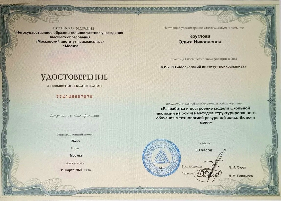В рамках курса были изучены современные подходы к организации инклюзивной образовательной среды, технологии структурированного обучения и принципы работы ресурсных зон для поддержки детей с особыми образовательными потребностями. По итогам обучения выдано удостоверение о повышении квалификации.