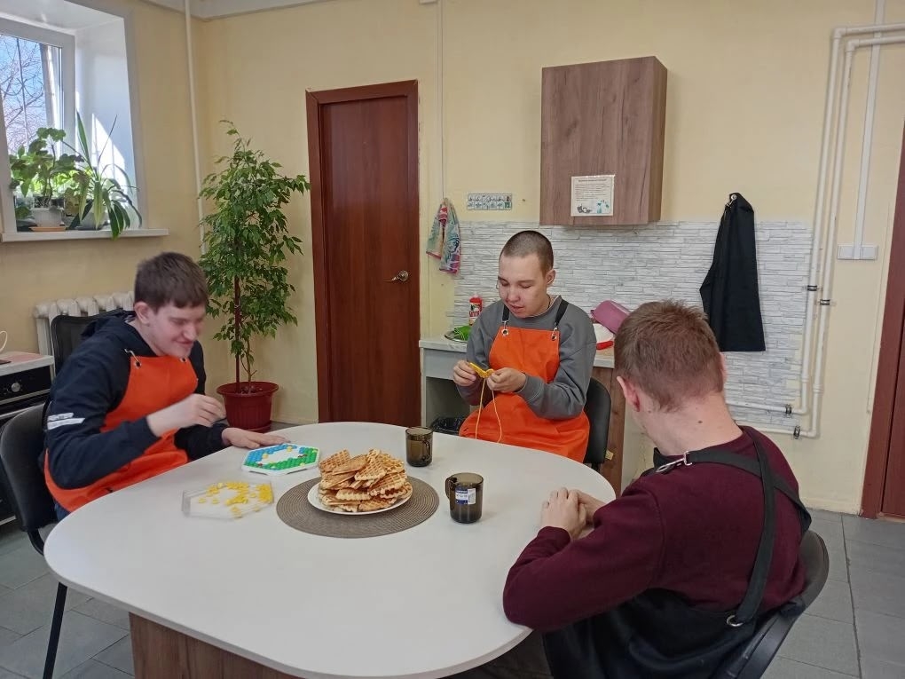 Ребята - участники программы социальной занятости. Дмитрию, Александру и Кириллу по 18 лет, все они имеют 3 степень ограничения к различной деятельности. Мальчишки приходят на занятия после школы несколько раз в неделю. 2 часа с ребятами занимаются специалисты сопровождения инвалидов. В этот день ребята учились готовить вафли. Сами замешивали тесто и выпекали, потом устроили чаепитие.
