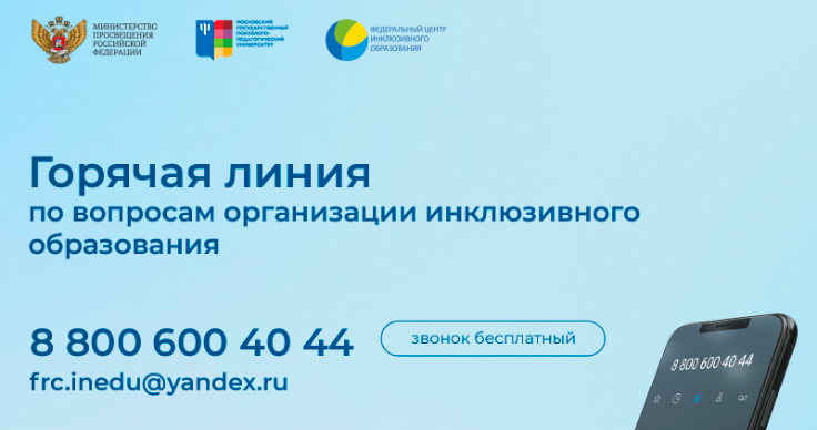 Продолжает работу Горячая линия по вопросам развития инклюзивного образования – 8-800-600-40-44, которая создана по заданию Министерства просвещения Российской Федерации и поддерживается Федеральным центром по развитию инклюзивного общего и дополнительного образования МГППУ.