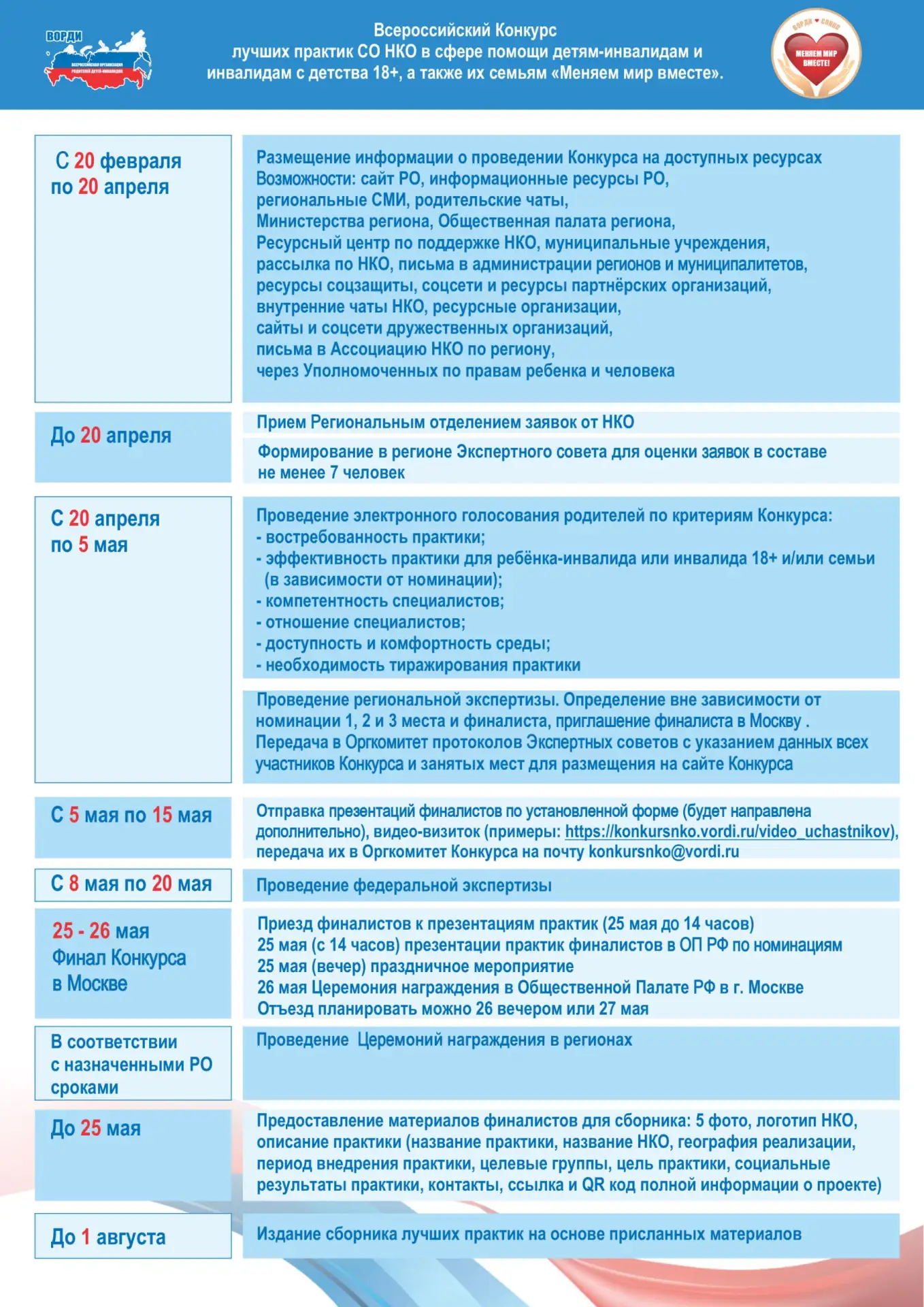 Размещаем информацию о ключевых датах проведения Конкурса лучших практик СО НКО «Меняем мир вместе» - 2026 и напоминаем, что заявки на участие в Конкурсе принимаются до 20 апреля 2026 г. на почты Региональных отделений ВОРДИ