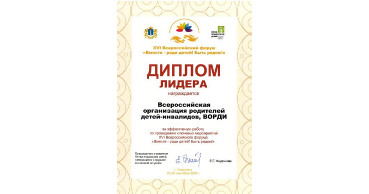 Всероссийскую организацию родителей детей-инвалидов, ВОРДИ отметили дипломом Лидера «За эффективную работу по проведению ключевых мероприятий XVI Всероссийского форума «Вместе – ради детей! Быть рядом!».