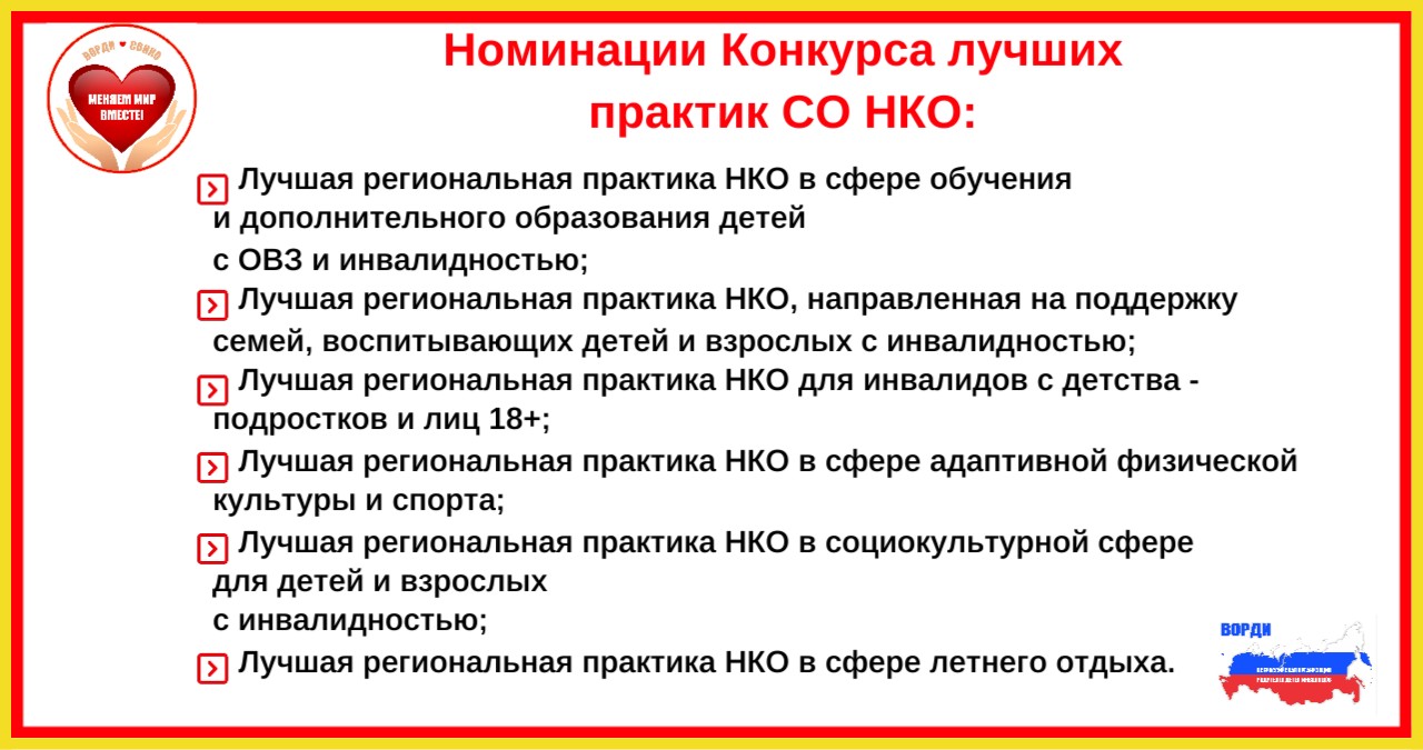 - Лучшая региональная практика НКО в сфере обучения и дополнительного образования детей с ОВЗ и инвалидностью;