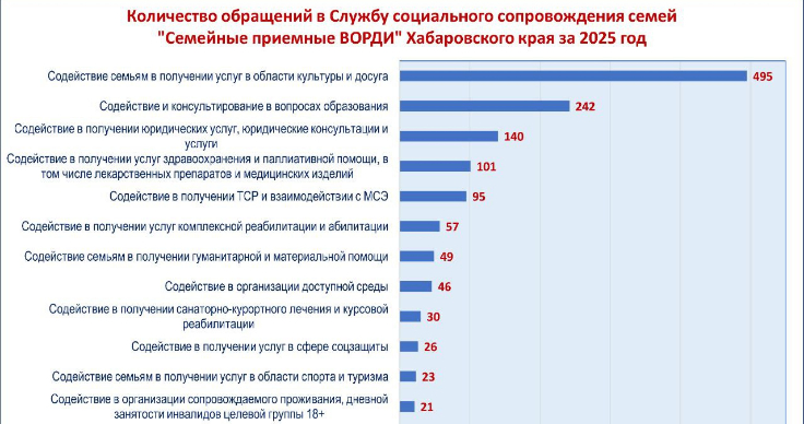 С 1 января 2025 г. по 30 декабря 2025 года в Службу социального сопровождения семей "Семейные приемные ВОРДИ" Хабаровского края поступило 1338 обращений. По состоянию на 30 декабря 2025 года в работе находились 42 обращения, по которым ожидаются ответы от ведомств и министерств. Эти обращения требуют социального сопровождения, а также многогранного подхода для решения возникающих вопросов и трудностей у семей, воспитывающих детей с инвалидностью.