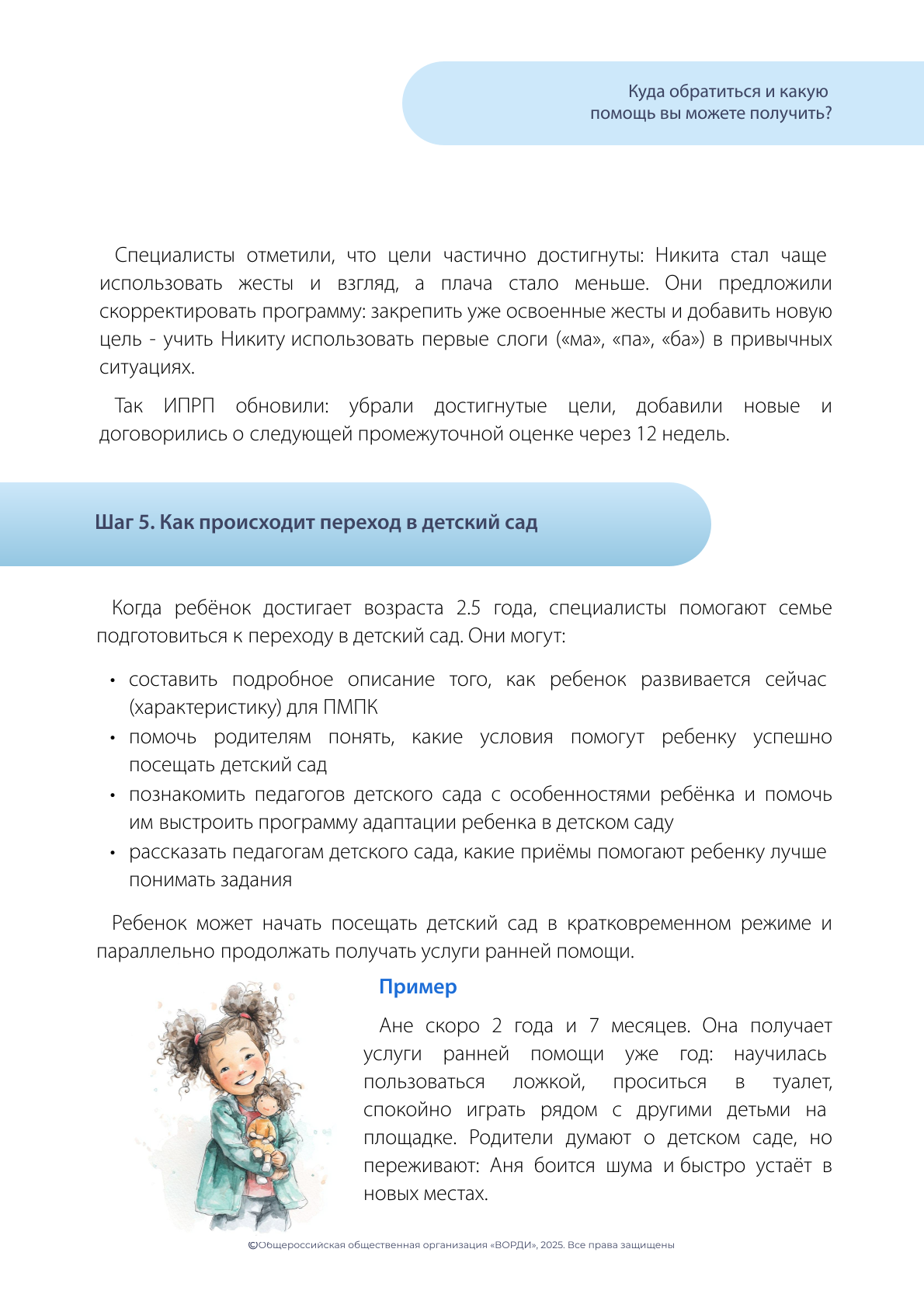 Когда ребёнок достигает возраста 2.5 года, специалисты помогают семье подготовиться к переходу в детский сад. Они могут: