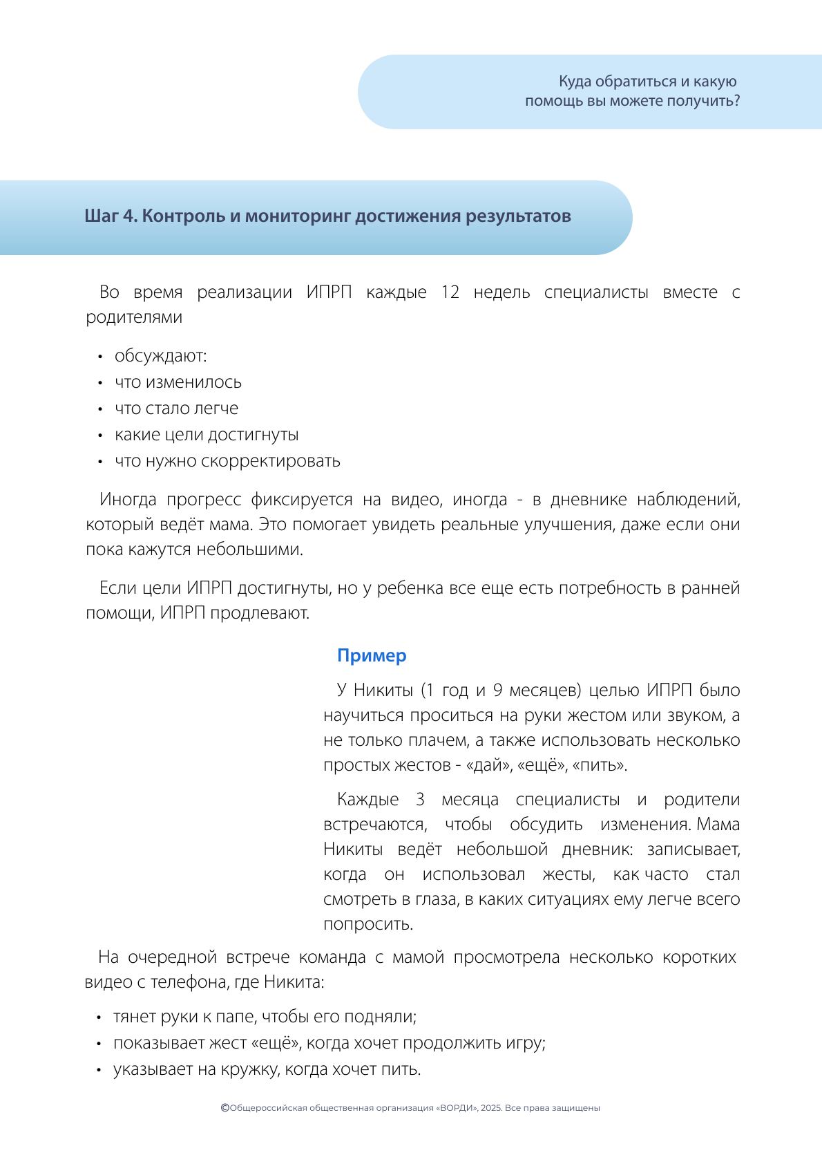 Во время реализации ИПРП каждые 12 недель специалисты вместе с родителями обсуждают:
