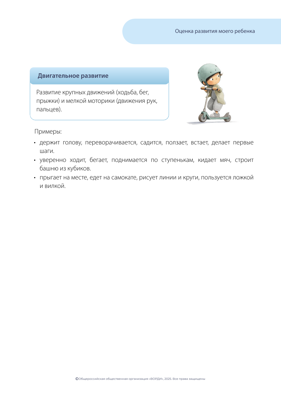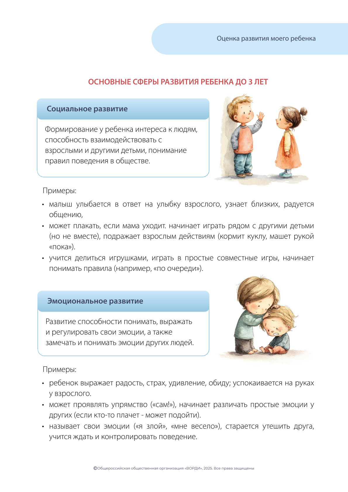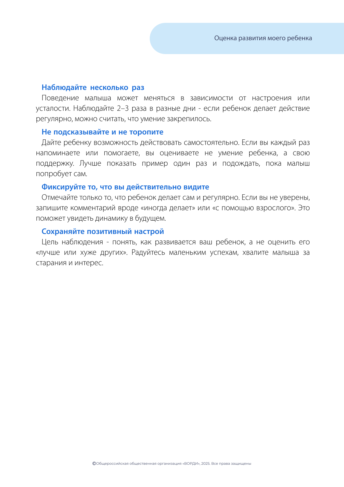 Наблюдая за своим ребенком во время игры и других повседневных дел, Вы можете следить за развитием его навыков по всем основным областям его жизнедеятельности.