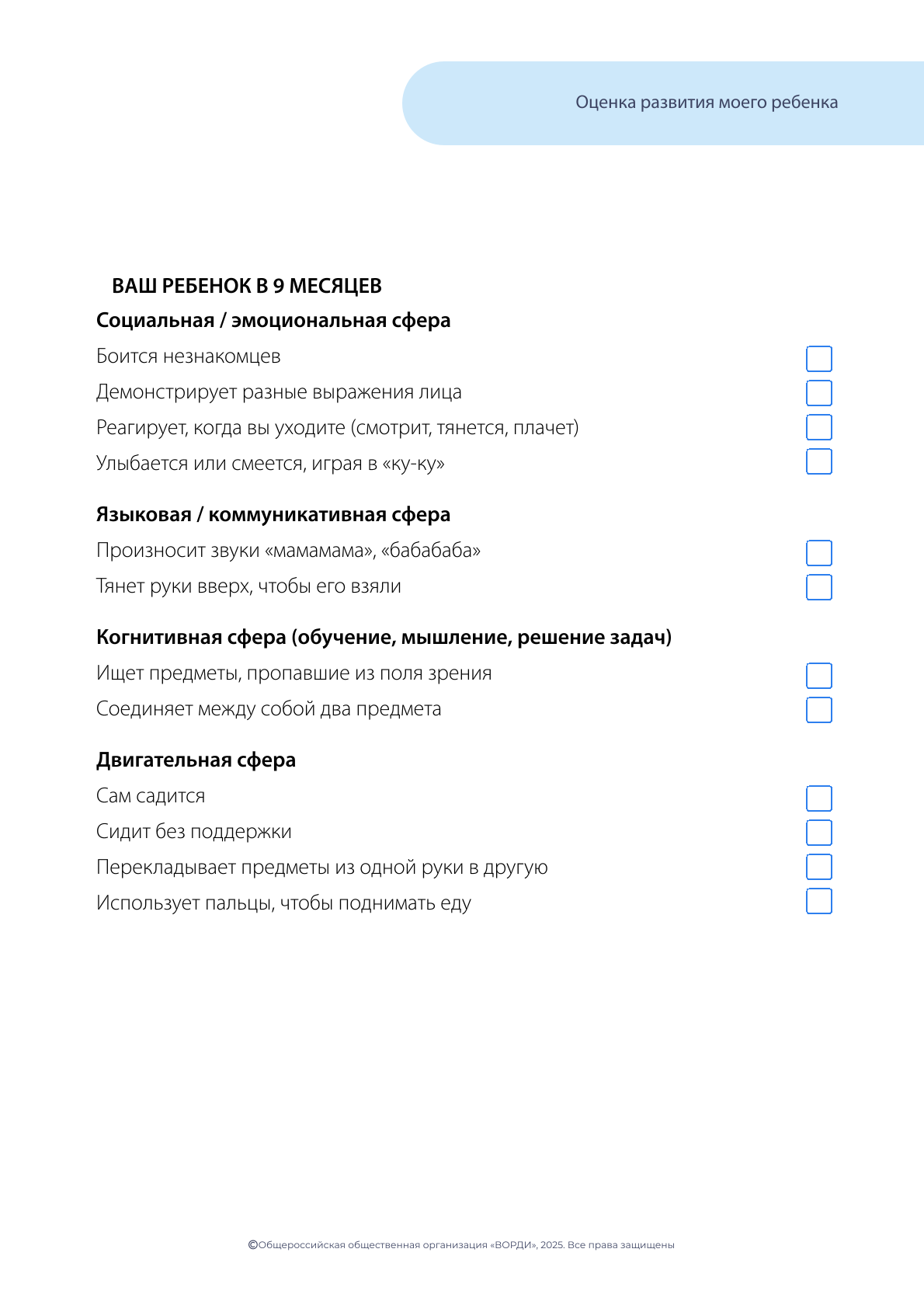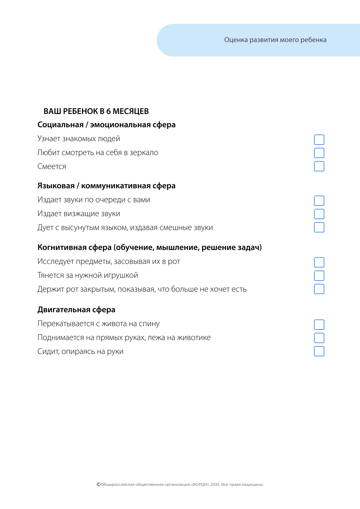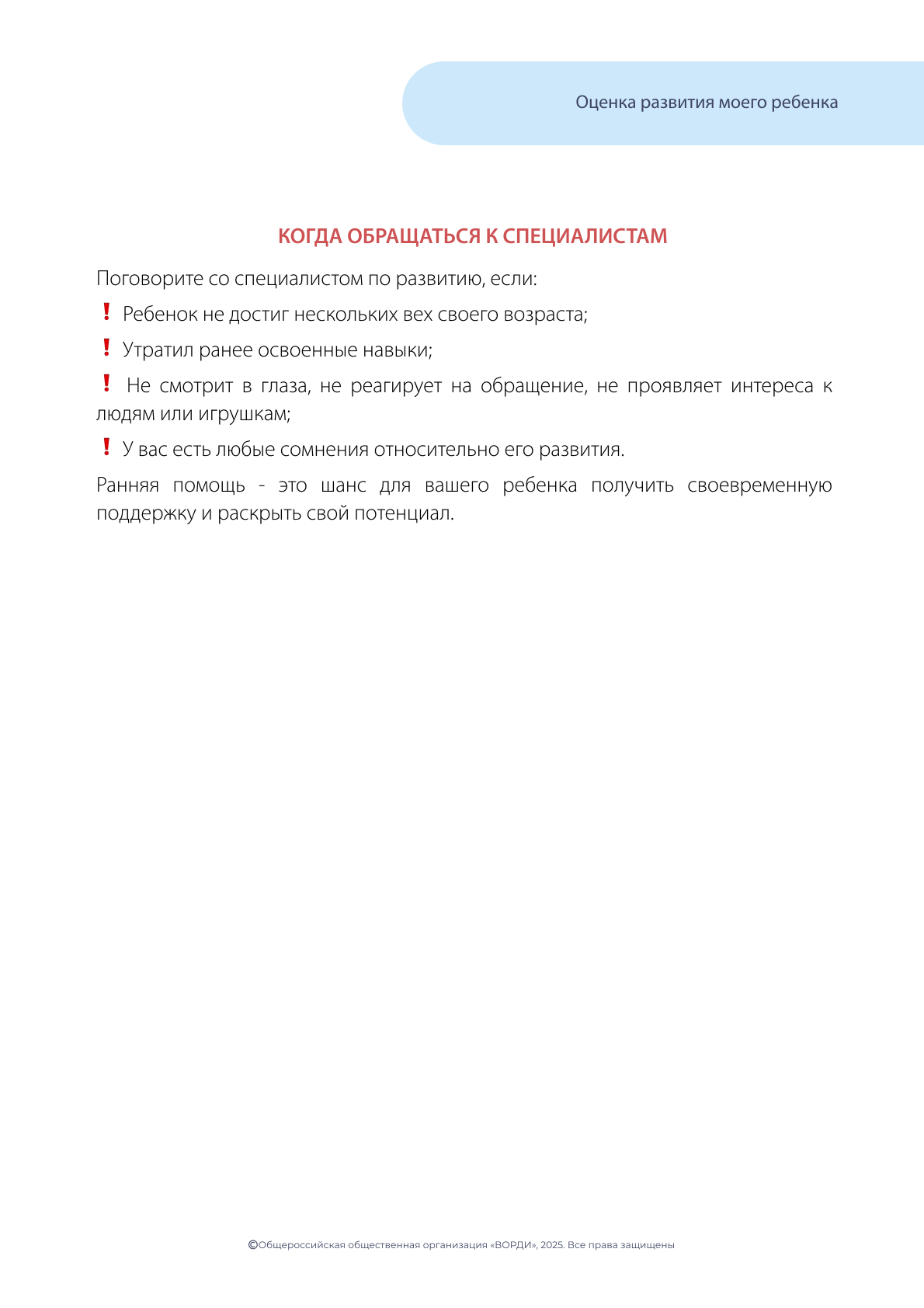 6. Если ваш ребенок не делает несколько пунктов для своего возраста, утратил умения или его поведение вызывает беспокойство - обсудите это с врачом-педиатром или обратитесь в Службу ранней помощи.