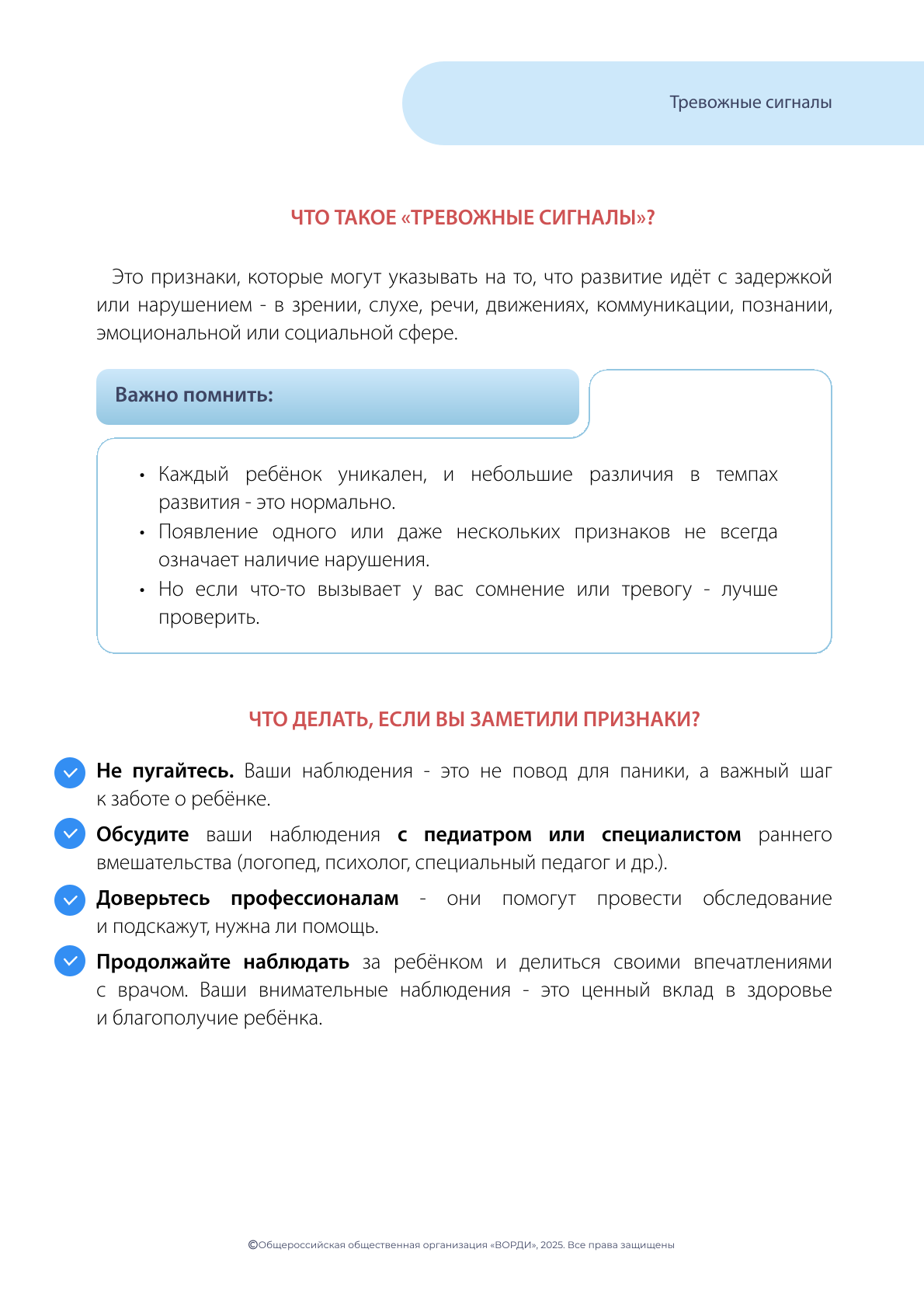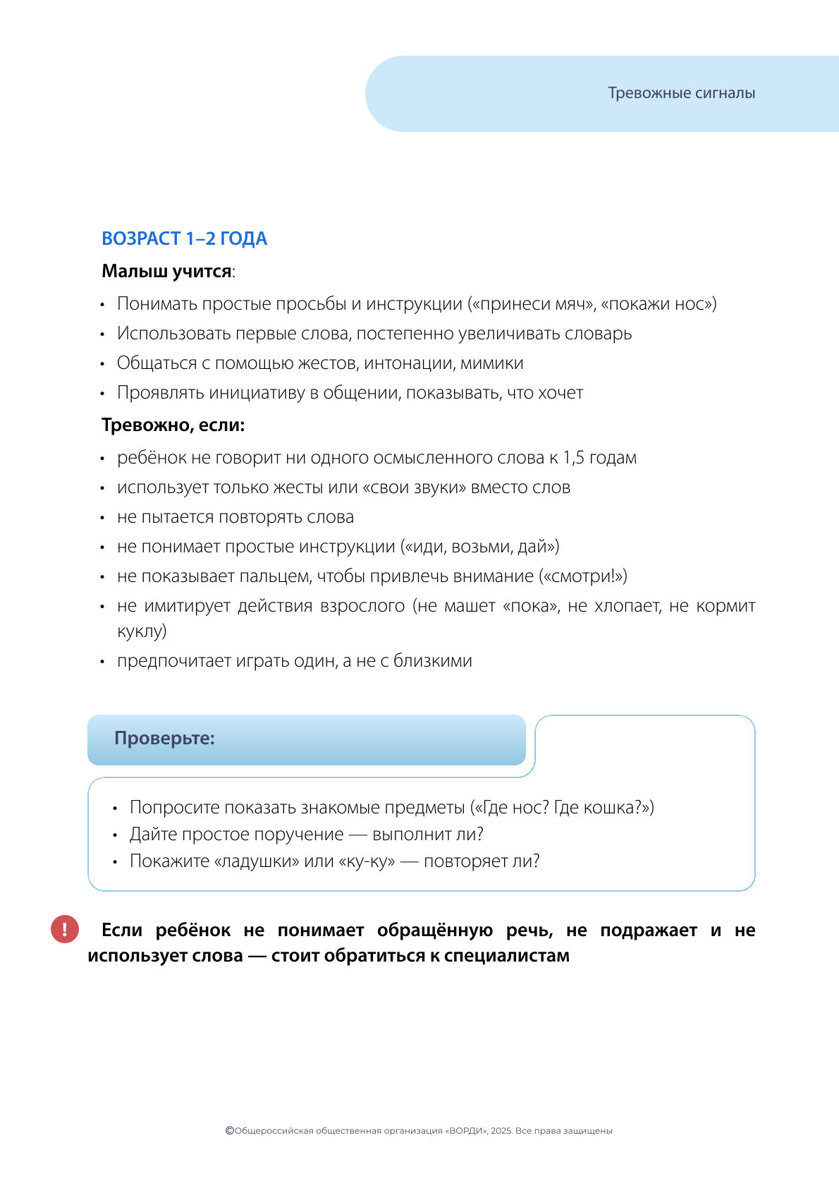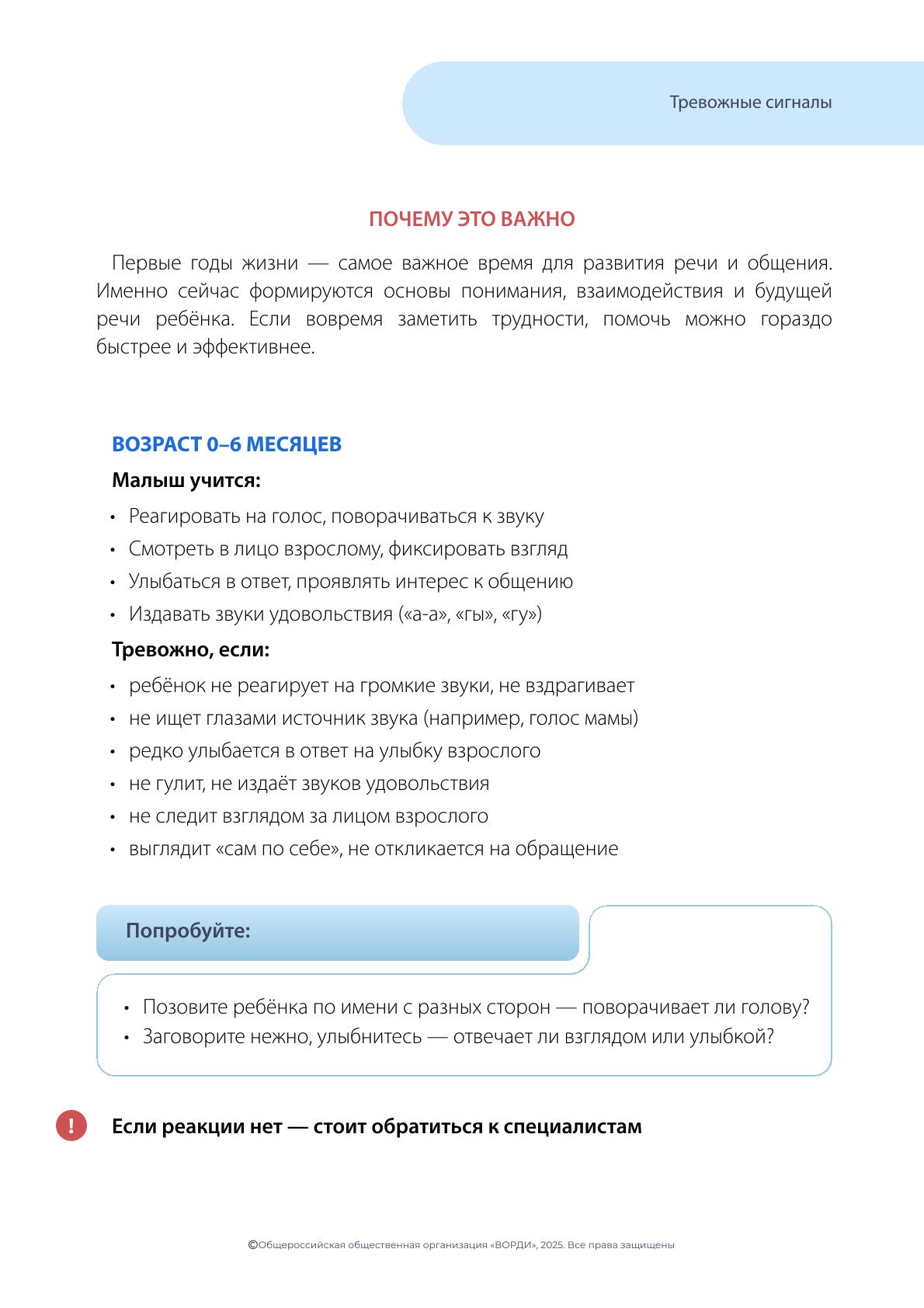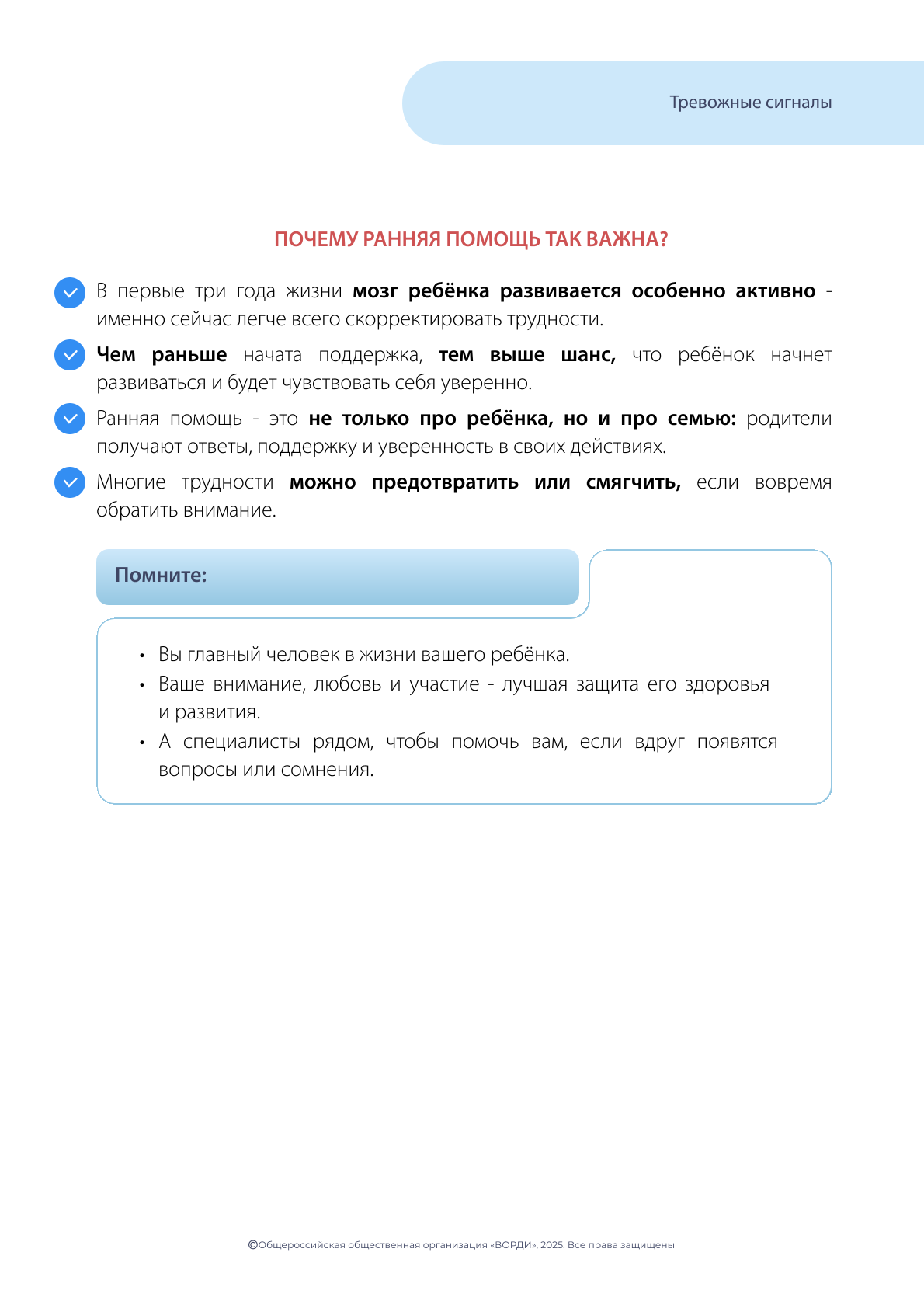 Не откладывая, обратитесь в Службу ранней помощи или к своему лечащему врачу, если вы заметили вышеуказанные признаки!