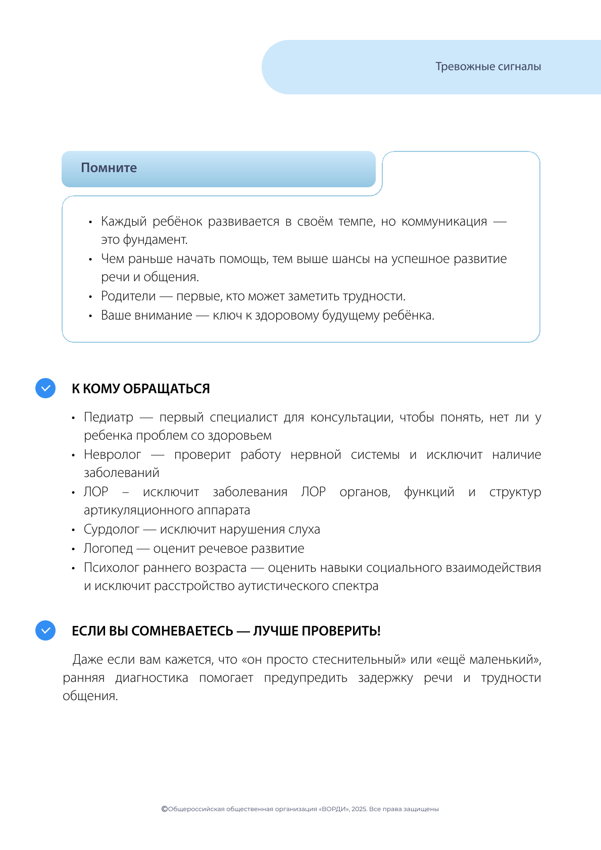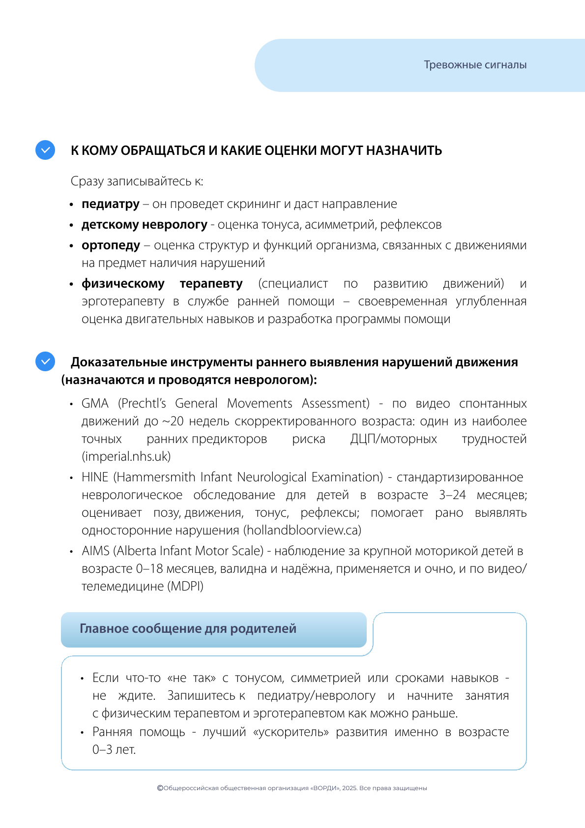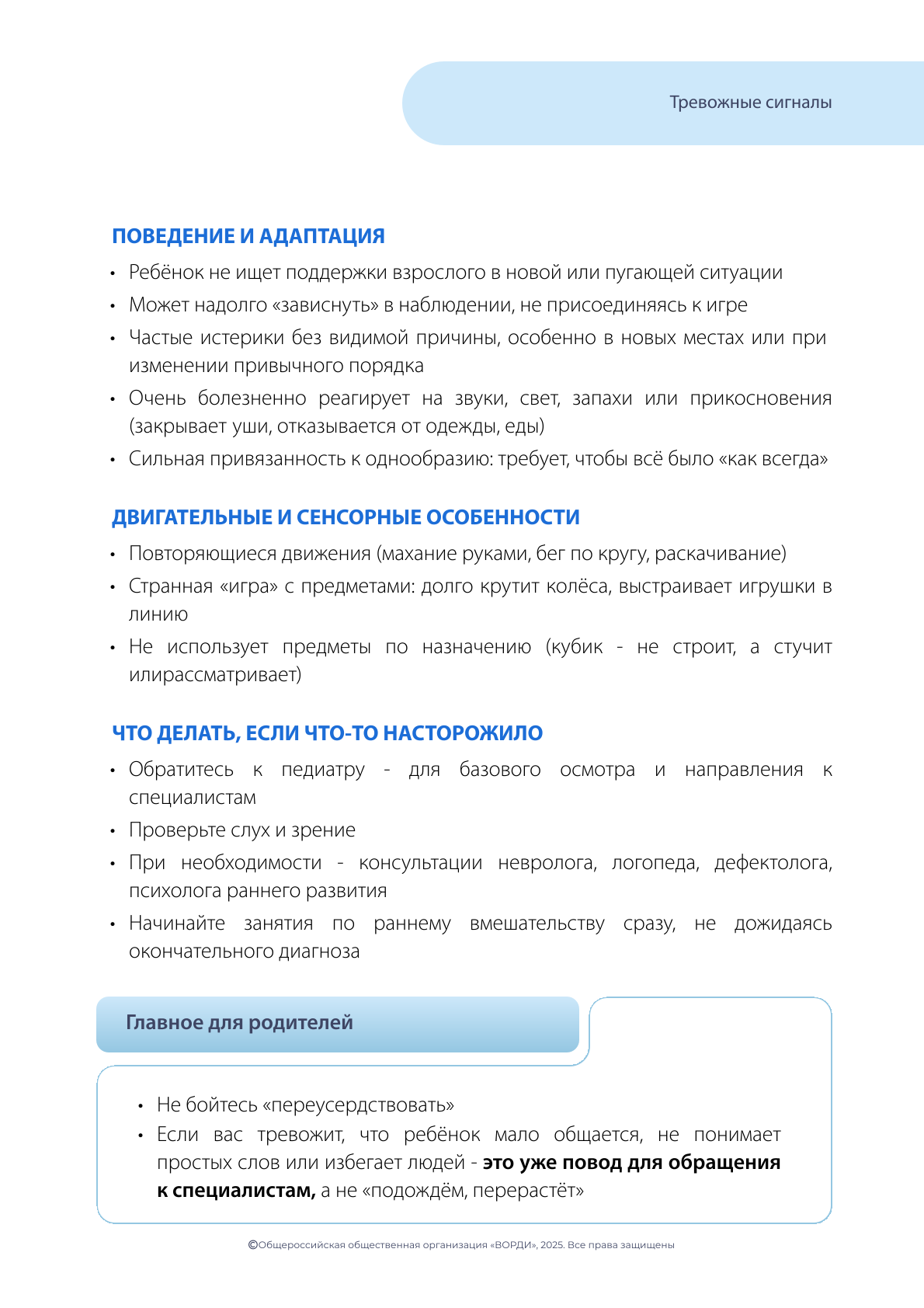 Не откладывая, обратитесь в Службу ранней помощи или к своему лечащему врачу, если вы заметили вышеуказанные признаки!
