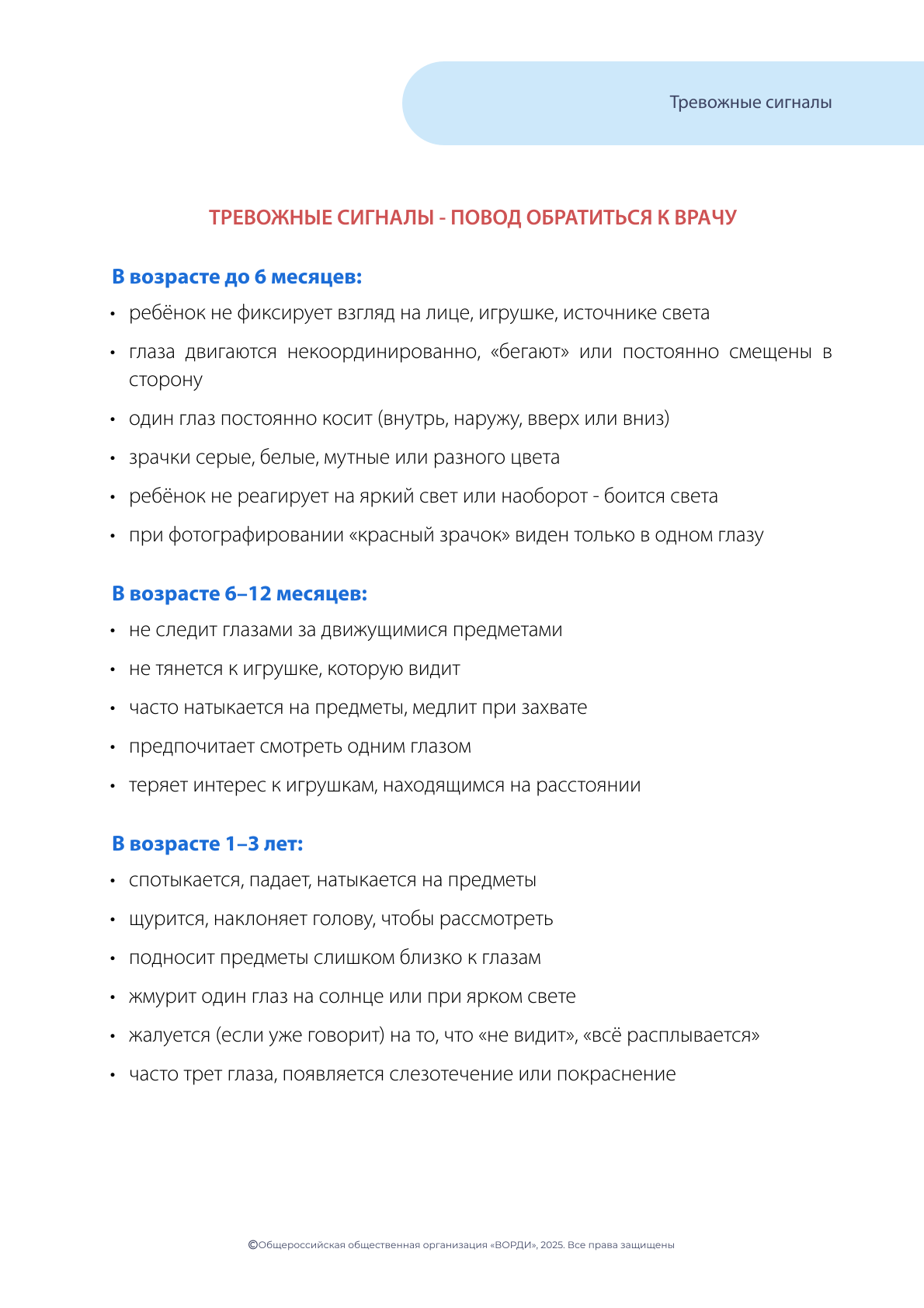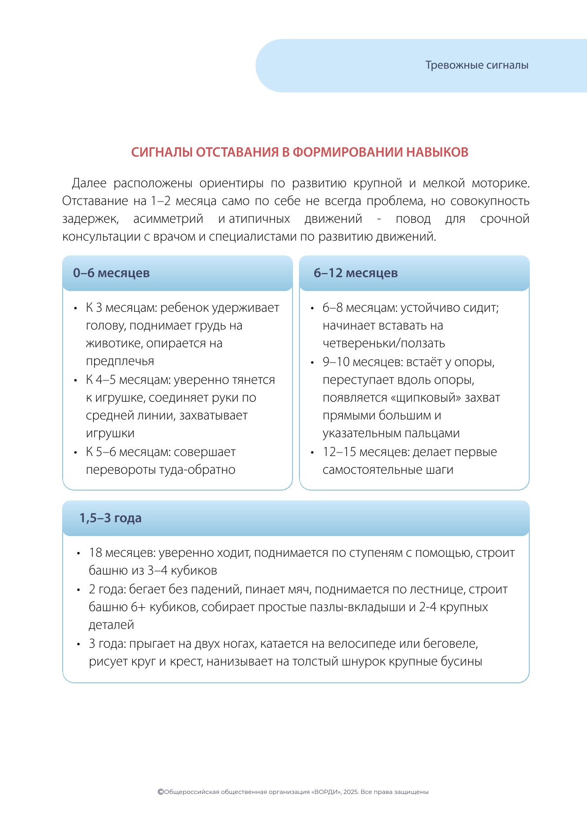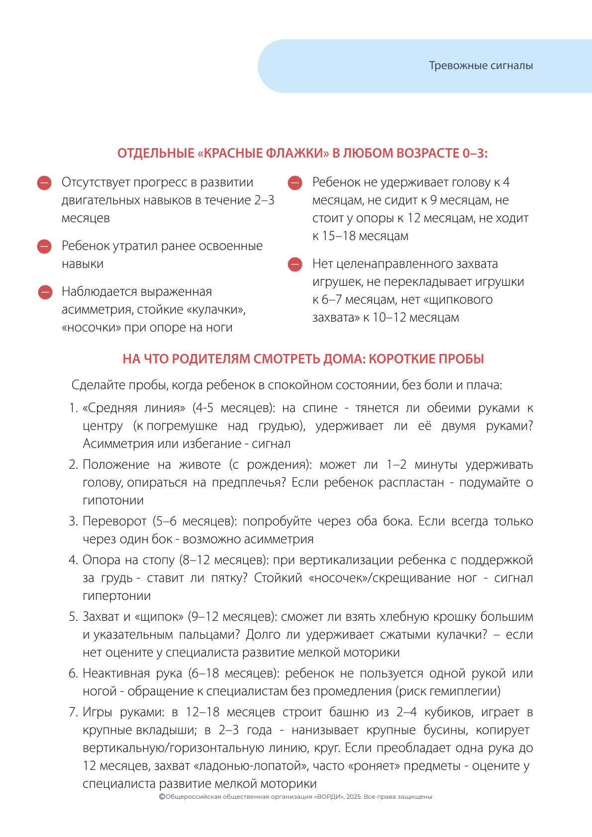 Для каждого возраста ребенка существуют свои так называемые «тревожные признаки» - признаки, заметив которые, необходимо как можно быстрее обратиться в Службу ранней помощи или к специалисту по развитию ребенка (это может быть детский психолог, педагог, врач-педиатр) для того, чтобы разобраться в ситуации, провести необходимую диагностику и не упустить драгоценное время.